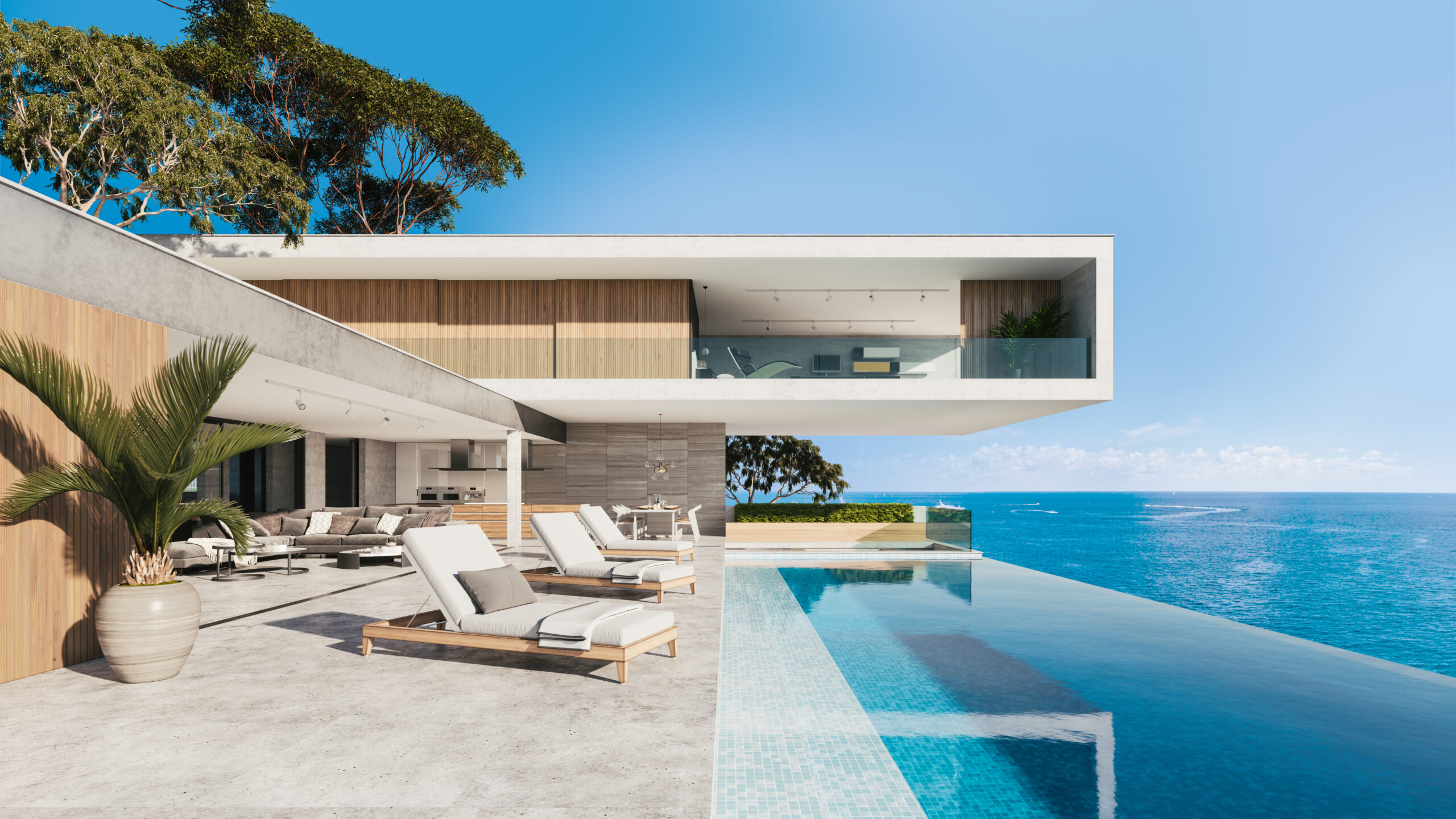Contemporary house with pool. Pool deck at private villa. 3d ill